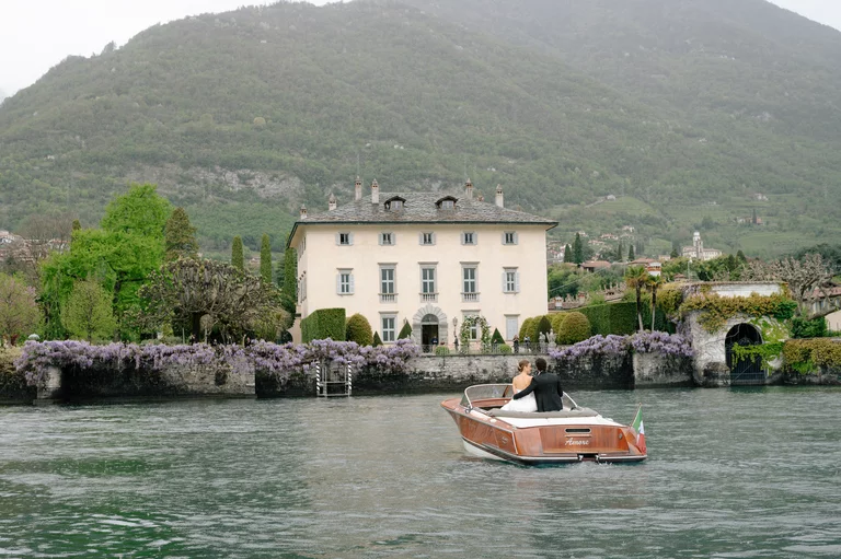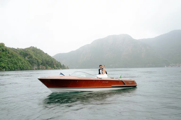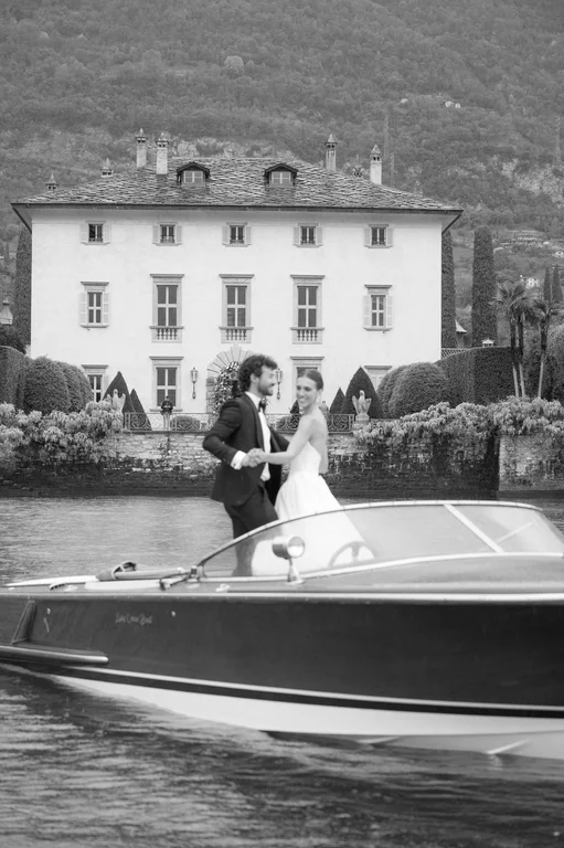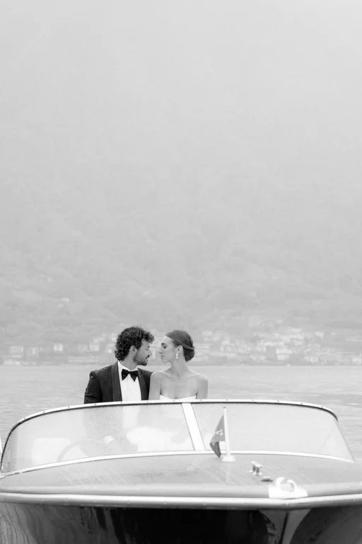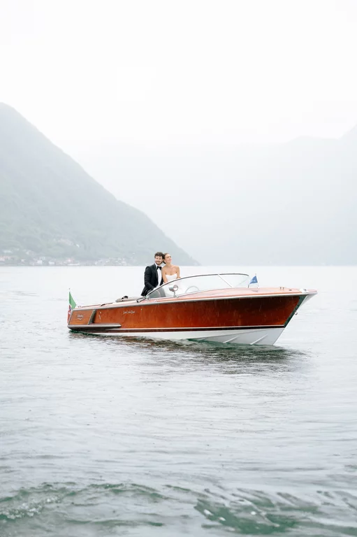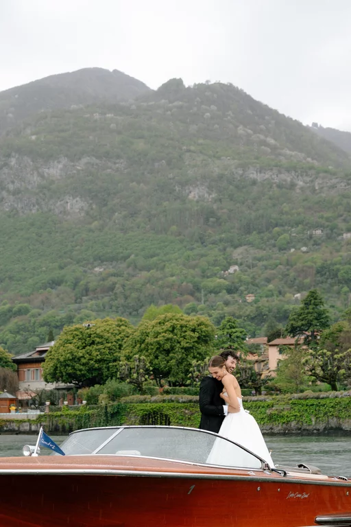Later, we traded the stillness of the garden for the sparkle of Lake Como, stepping onto a classic wooden boat for a little tour. The soft wind, the gentle waves, and the laughter we shared made this one of my favourite parts of the day. Photographing a couple against the shifting colours of the lake, with the mountains in the distance, is pure magic – and these images always become some of the most treasured memories of a wedding here.